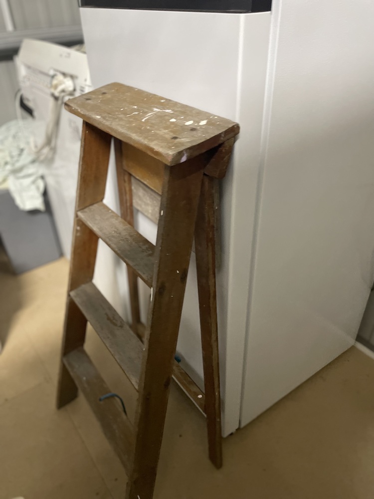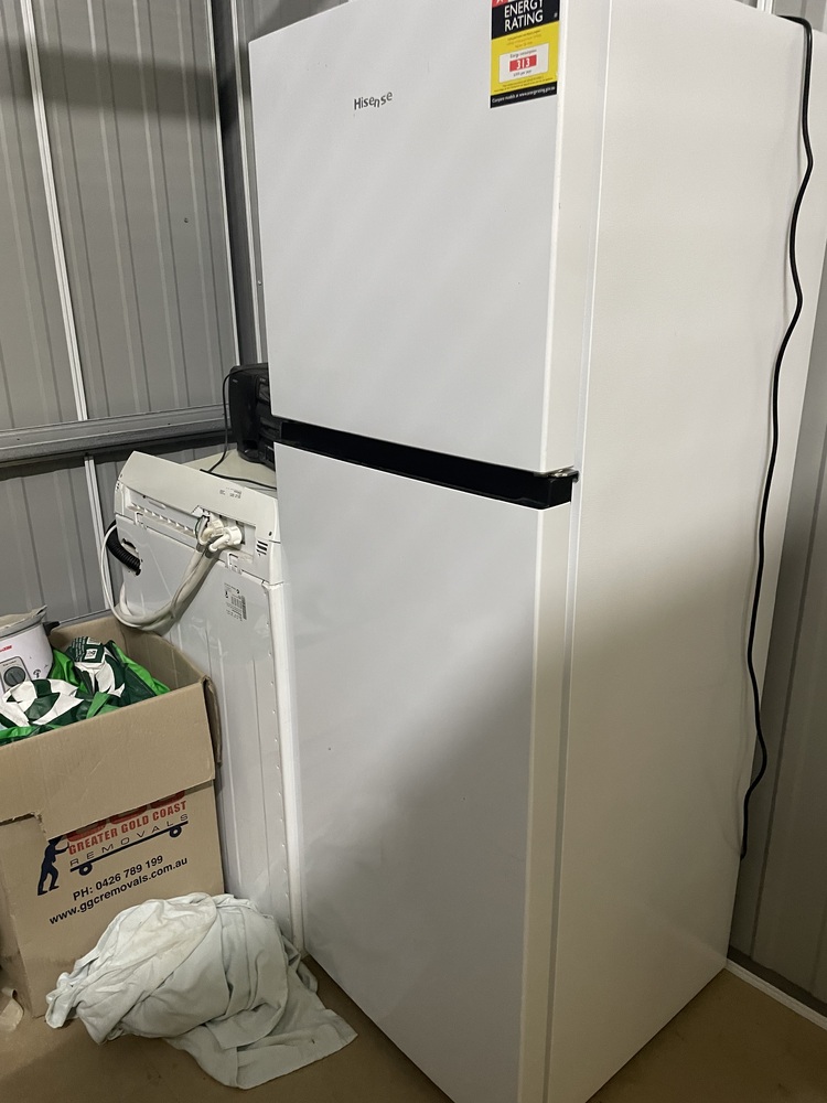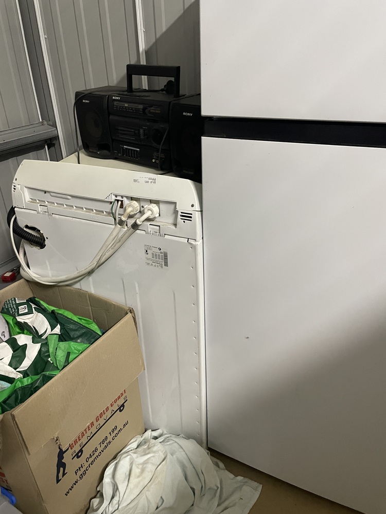 Fridge, washing Machine, Draws, Bed, side table, lounge chair