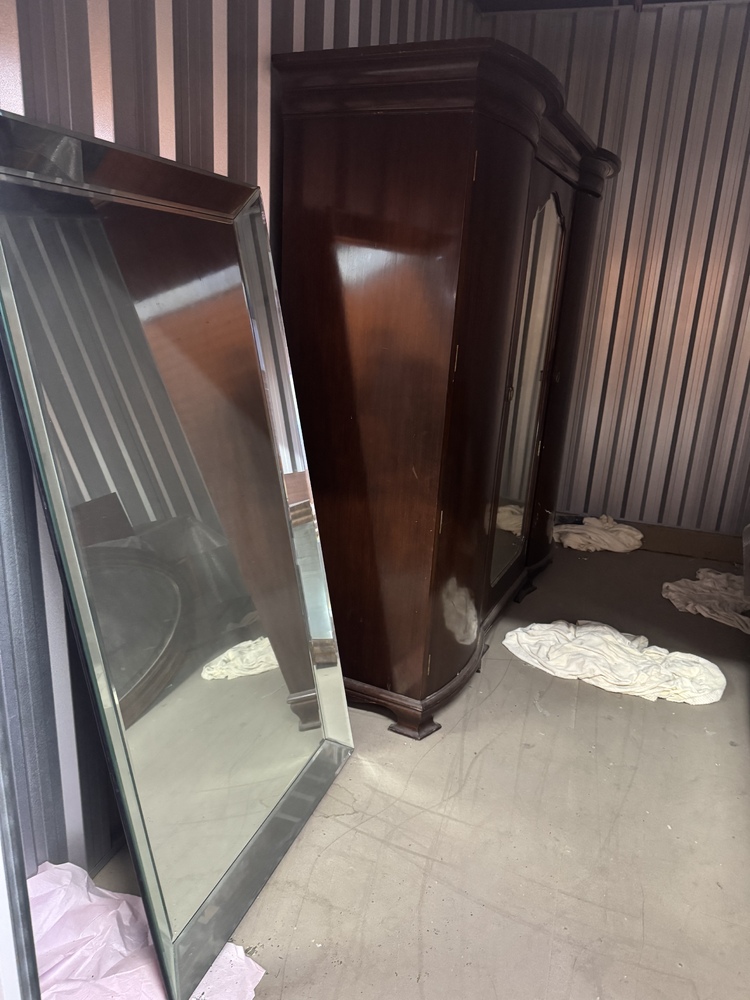 • Solid timber wardrobe with curved cornice detail and mirrored door, classic design, good condition