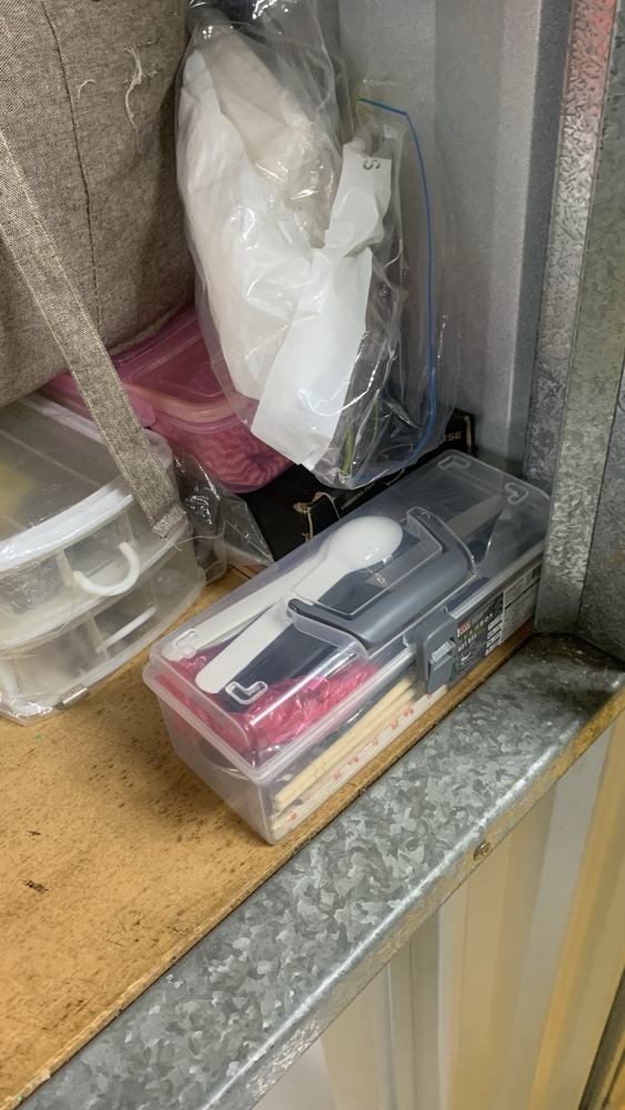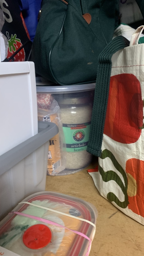 Contents of a compact overhead storage unit including a mixed assortment of household goods, personal items, and small appliances.