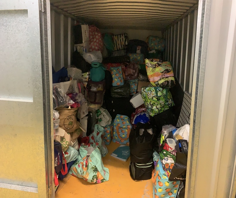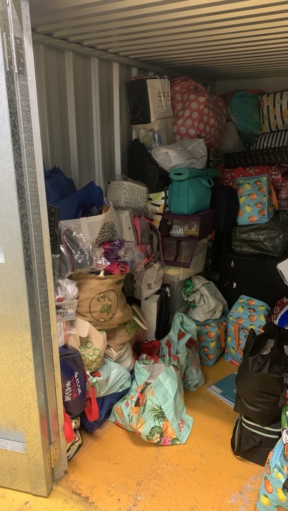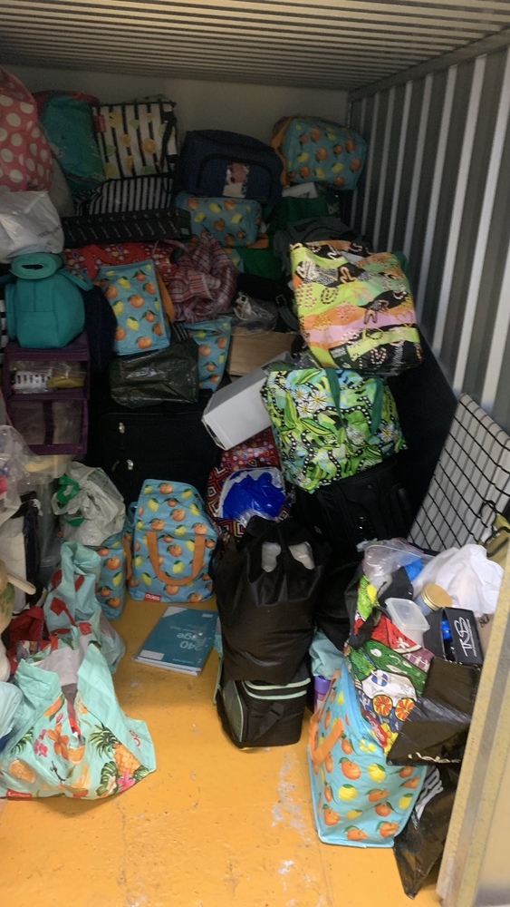 Contents of a standard walk-in storage unit containing a large volume of household goods, personal belongings, and packed bags. Unit is densely filled from front to back, indicating substantial quantity of items.