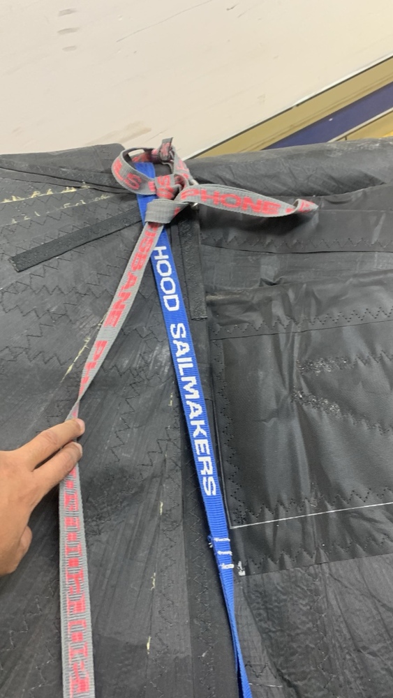One folded windsurfing sail (sailboard rig component), secured with straps. Appears to be a performance sail used for water sports, suitable for windsurfing enthusiasts or resale.