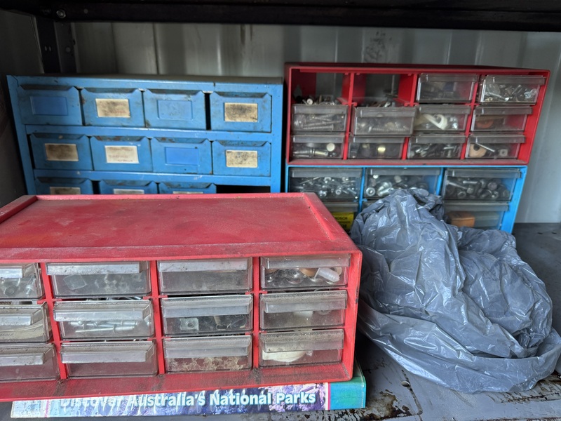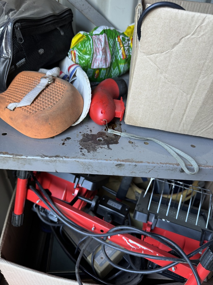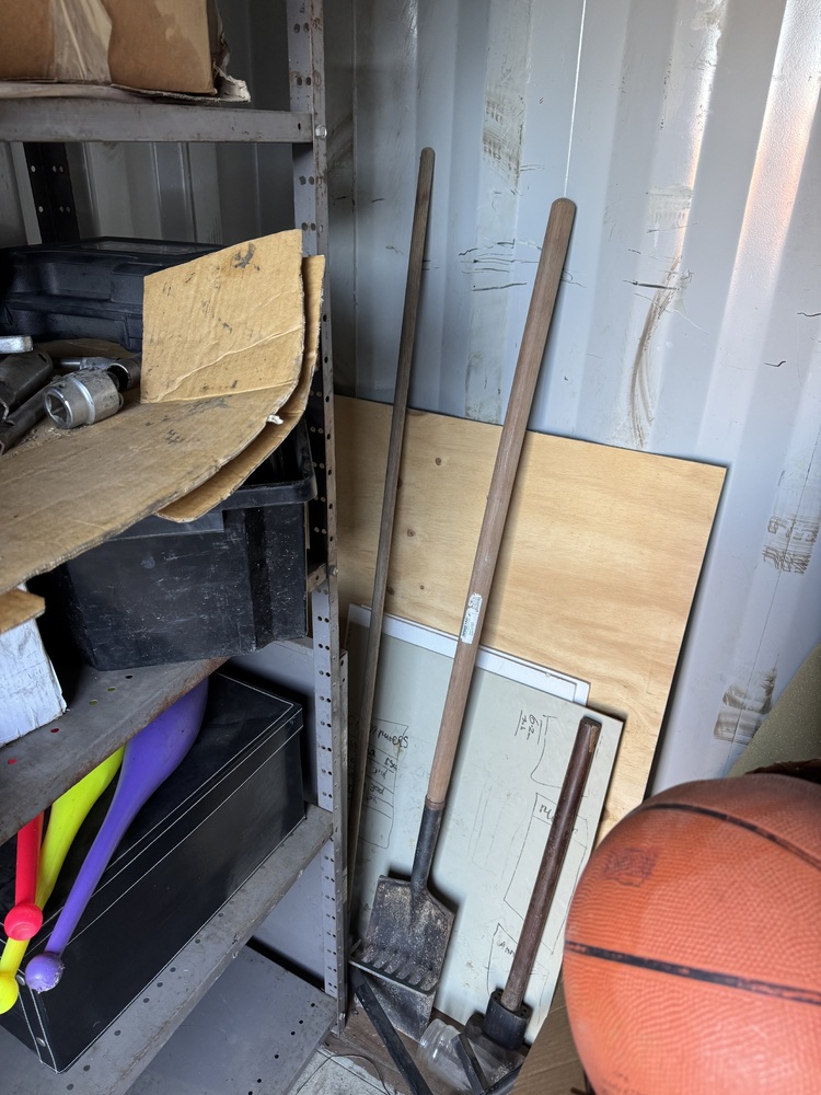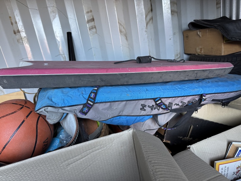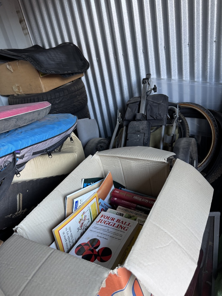 Tools, filing cabinet, set of side drawers, boogie board, juggling items, car wheels, golf buggy, 2 wooden chairs etc etc