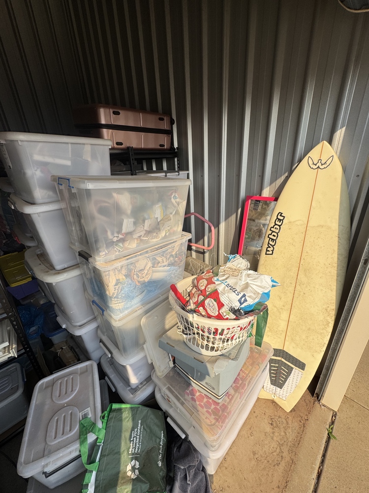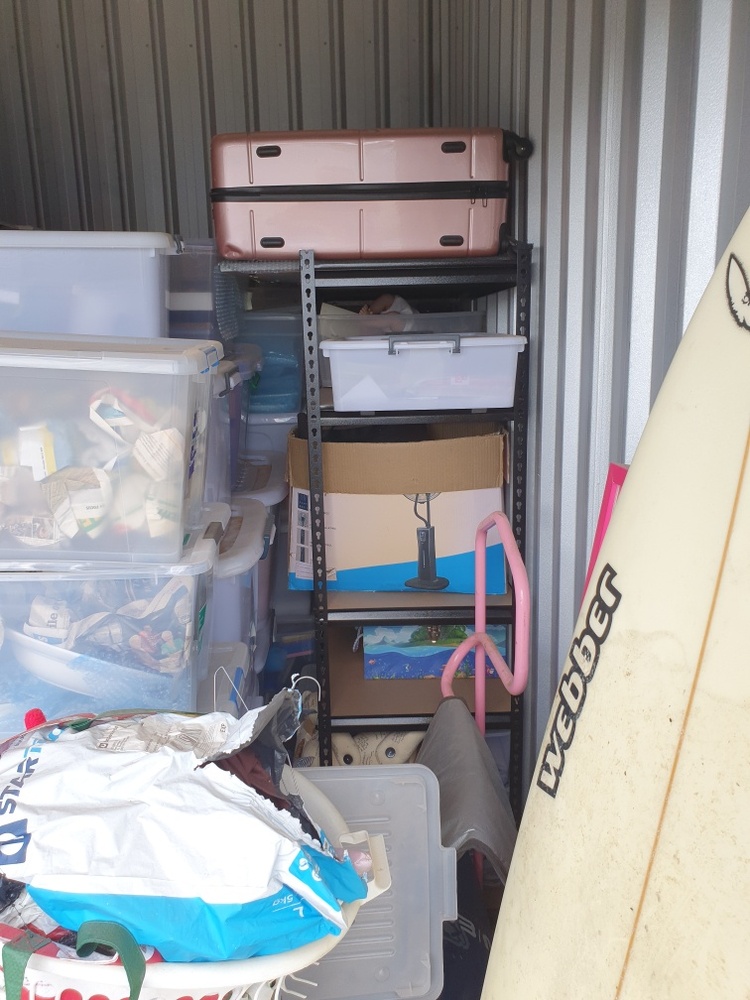 Storage space contains surfboard, TV, shelving and boxes of items