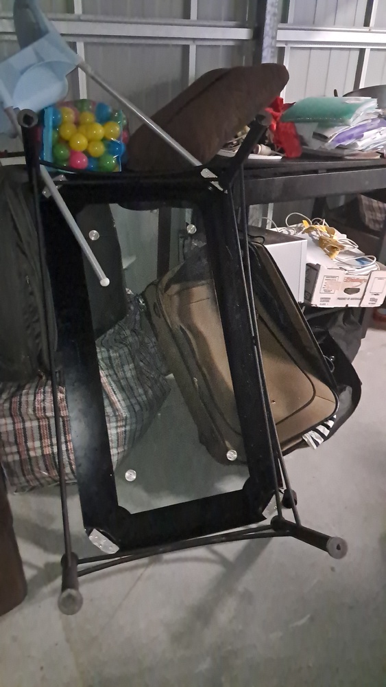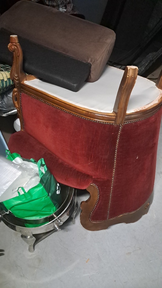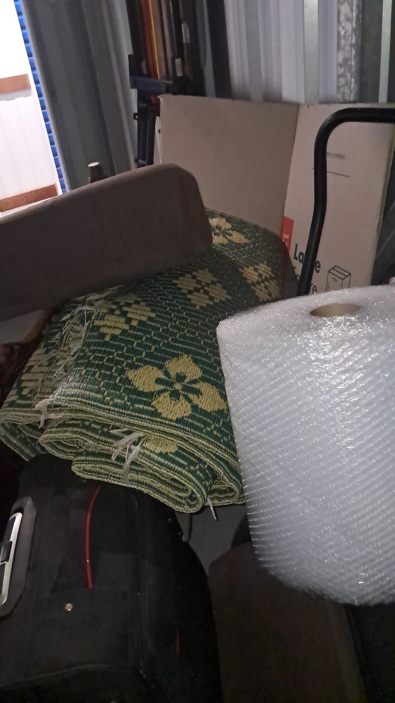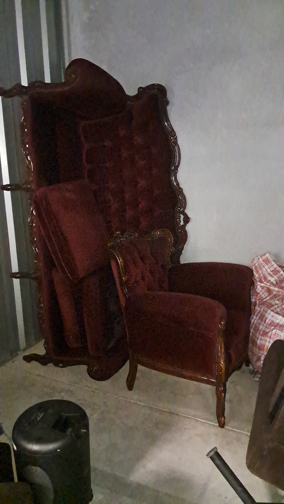 red suede lounge suite, microwave, mattress, lounge, rugs, baby bath, bag of clothes, fold out tables, coffee table (glass) suitcases