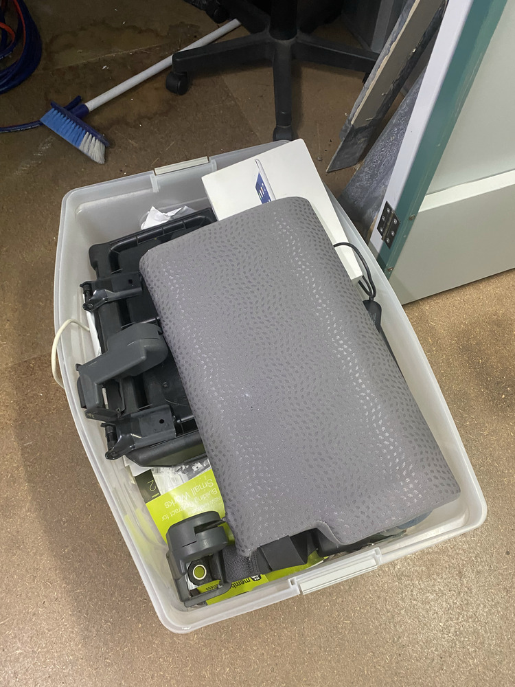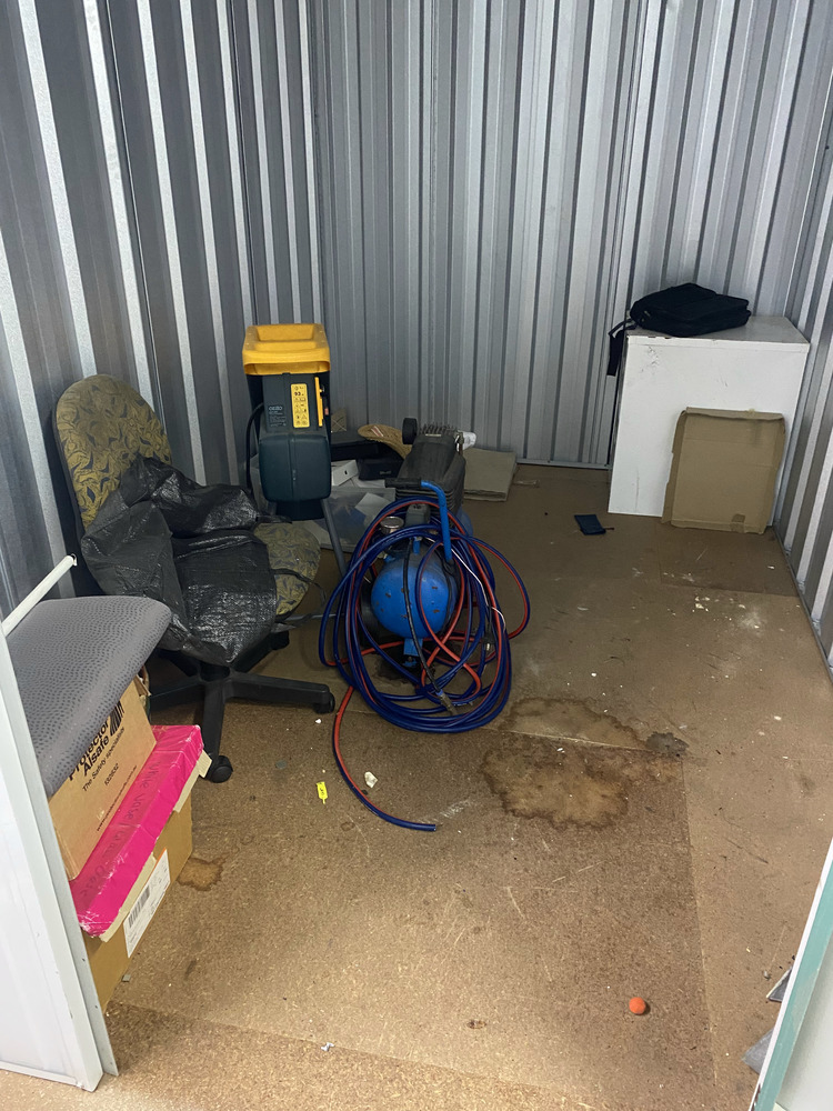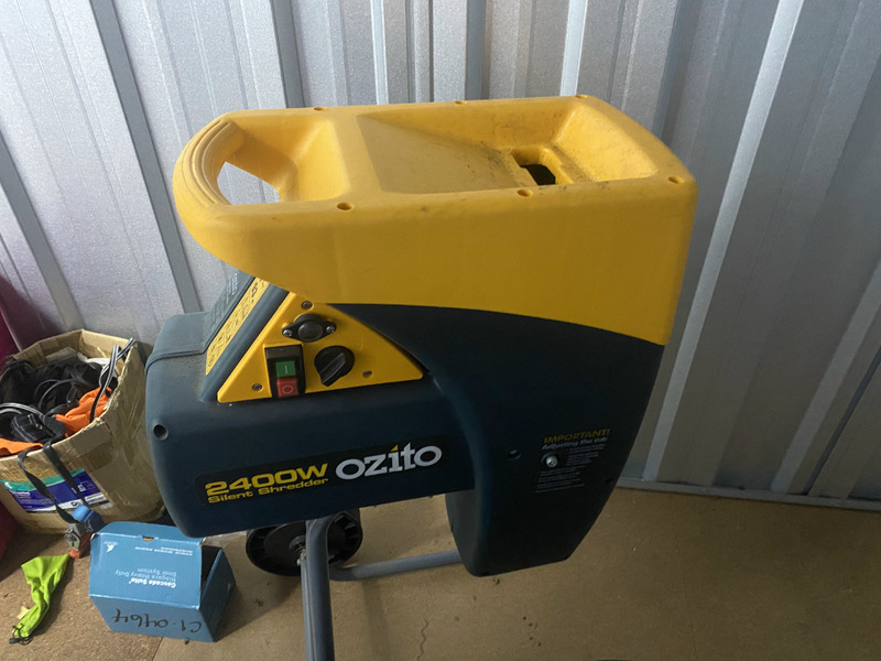 Ozito Shredder, Compressor, Student Chair, 2 Metal - 90 degree corners, Filing Cabinet, Container assorted paperwork / magazines, Boxes of Work Clothing, Box with towel, Bike Helmet, Printer, Nokia Phone, TomTom, Laptop Case, Back rests, Broom