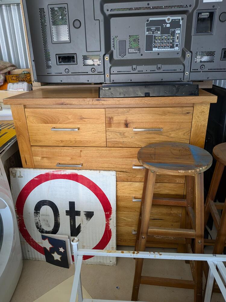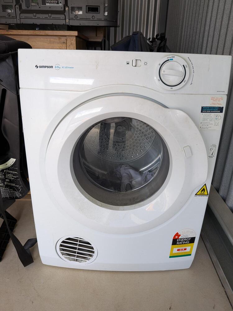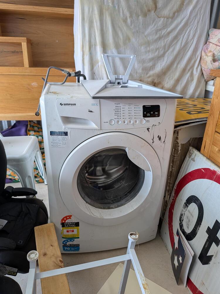 3x Car Seats, Single Mattress and Bed Frame, 50" Panasonic TV, Tall Boy, 2x Bar Stools, Road Signage, Simpson Front Load Washing Machine, Simpson Dryer, Kings Swag, Metal Dining Chair, a few assorted household goods.