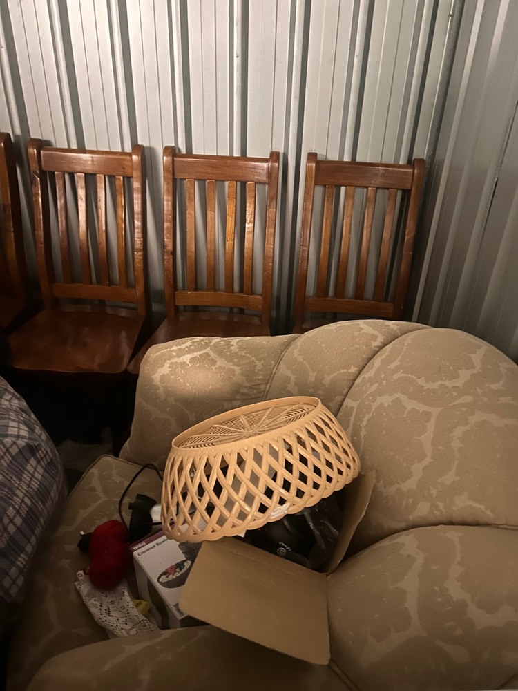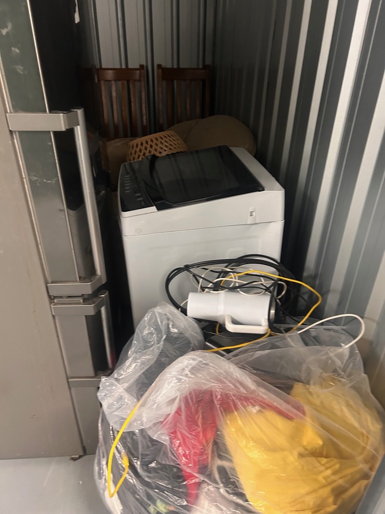 fridge, washing machine, lounge suite, dining chairs, coffee table, clothing, kitchen misc