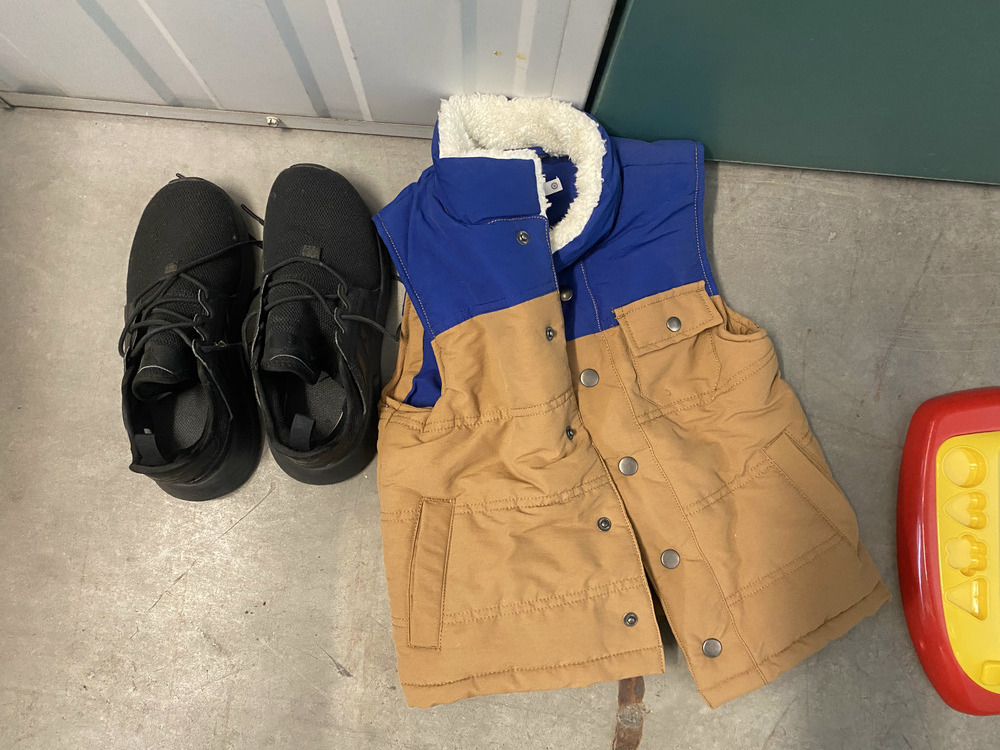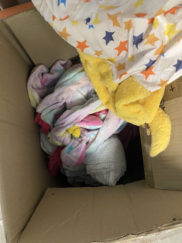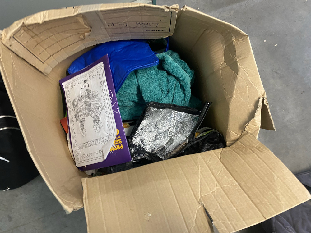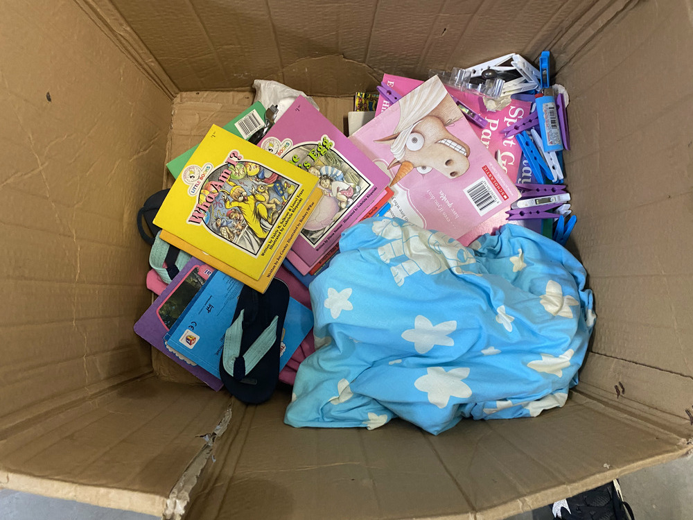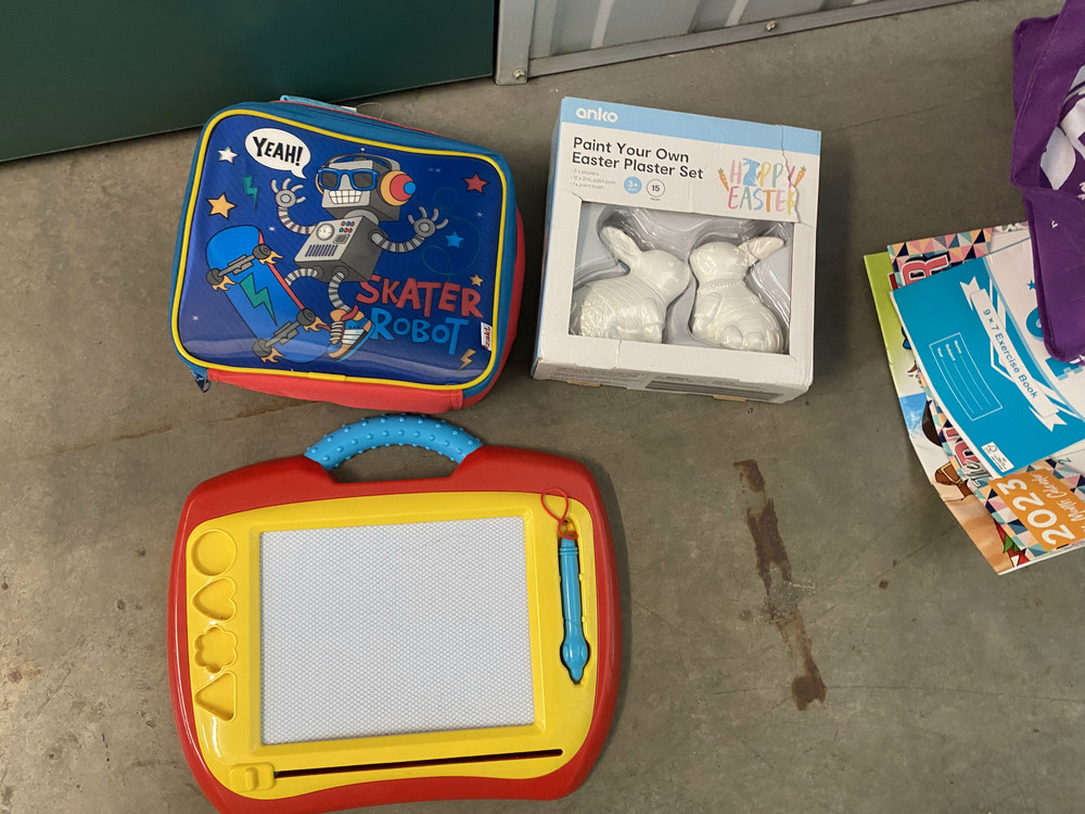 Childrens car seat, Box of assorted Clothing and Childrens Sleeping bag, 2 x Pool Noodles, Folder, 2 Containers of Assorted Toys, Empty plastic bags, Box with assorted items / books / towel, Backpack, bag with bowls / cup, Bag of Toiletries, Paint your own Easter Plaster Set, Childrens Lunch bag and bottle, Drawing board, Childrens Jacket and Shoes, Box with Books / clothing and laundry pegs.
