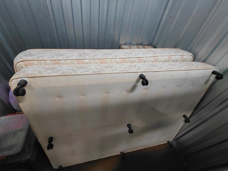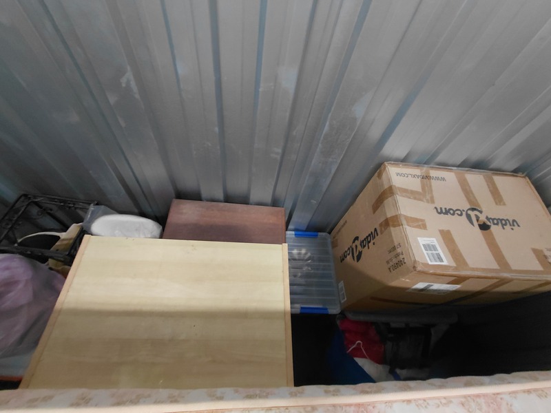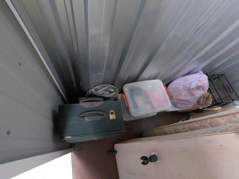 Unit has a double bed ensemble, 5 clear storage tubs, a suitcase and miscellaneous boxes and bags.