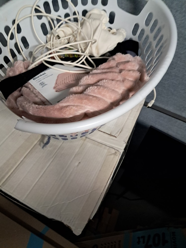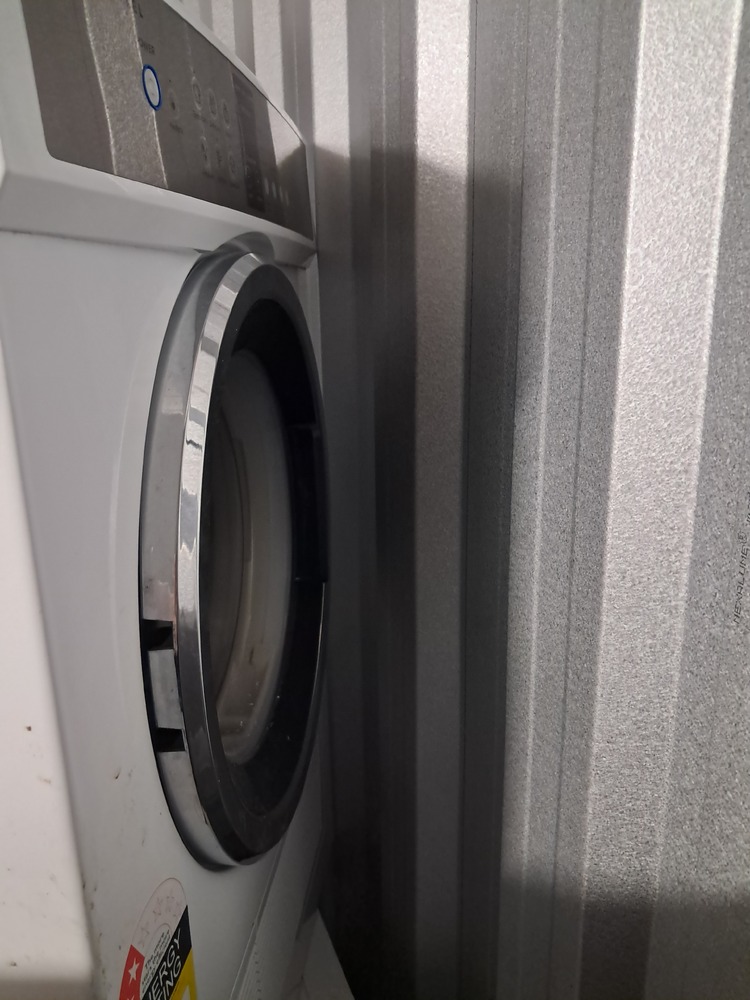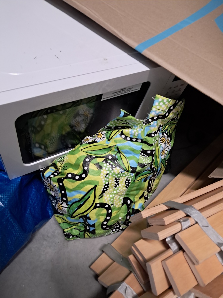 Wooden coffee table, Fisher & Paykel dryer, microwave, bags of clothes, linen and soft toys, Fisher & Paykel washing machine, TV (maybe 40"), vacuum cleaner.